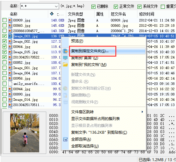 4、接著我們將丟失的文件復(fù)制到其他盤,完成U盤格式化恢復(fù)。勾選我們需要恢復(fù)的文件,鼠標(biāo)右鍵點(diǎn)擊,選擇"復(fù)制到指定文件夾"。