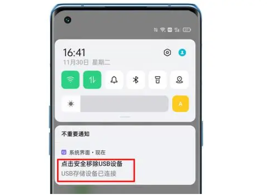 5、對(duì)U盤的操作結(jié)束后,若想拔下U盤,需要下滑屏幕調(diào)出通知欄,并在系統(tǒng)界面點(diǎn)擊安全移除USB設(shè)備,然后再斷開(kāi)U盤與手機(jī)的連接。