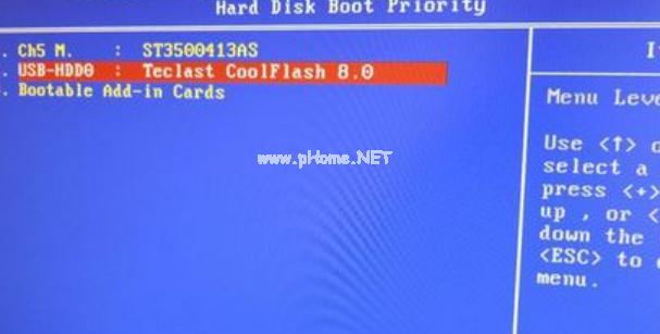 4、選擇USB-HDD按加減號或F5/F6或PageUP/PageDown,移動到第一位置,按F10回車重啟即可U盤啟動。