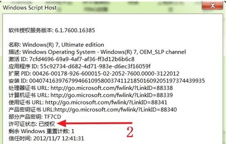 6.看出Win 7系統(tǒng)的許可證狀態(tài)是“已授權(quán)”狀態(tài),說明激活成功。