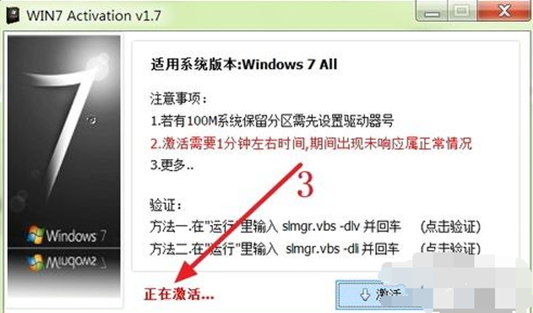 3.程序界面出現(xiàn)“激活中”,說明正在激活Win 7操作系統(tǒng)。