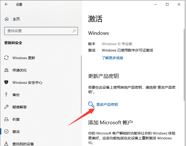3、選擇更改產(chǎn)品密鑰,輸入win10專業(yè)版密鑰,點(diǎn)下一步,激活完成。