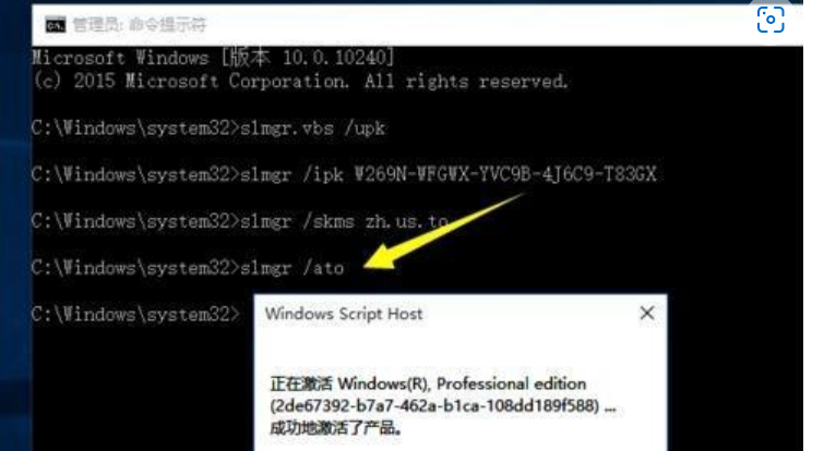 5.當(dāng)再輸入以下命令時:slmgr /ato 按回車鍵后將彈出“成功的激活了產(chǎn)品”的提示窗口;