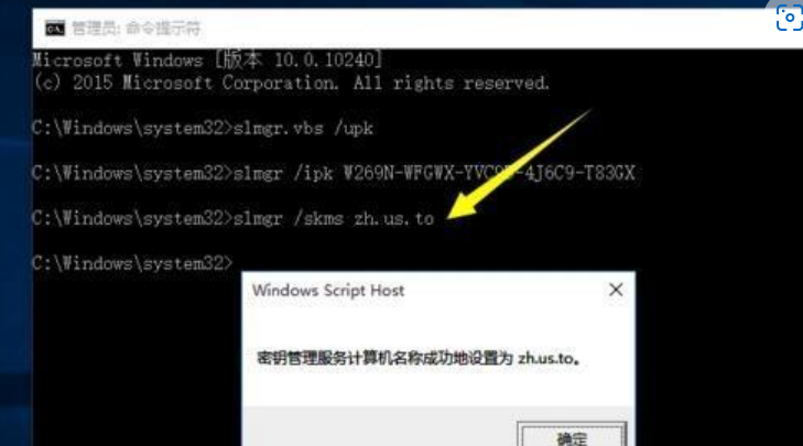 4.然后繼續(xù)輸入以下命令: slmgr /skms zh.us.to 按回車后將彈出“密鑰管理服務(wù)計算機(jī)名成功的設(shè)置為zh.us.to”的提示;