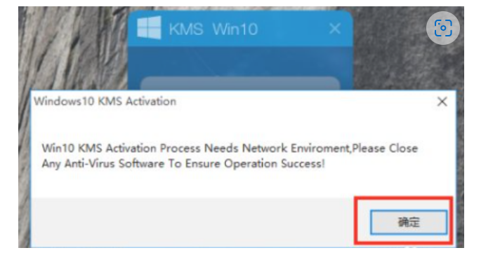 5、之后會彈出對話框,點擊確定(中文:windows10 KMS激活過程需要網(wǎng)絡(luò)環(huán)境,請關(guān)閉任何反病毒軟件保證安裝成功!)