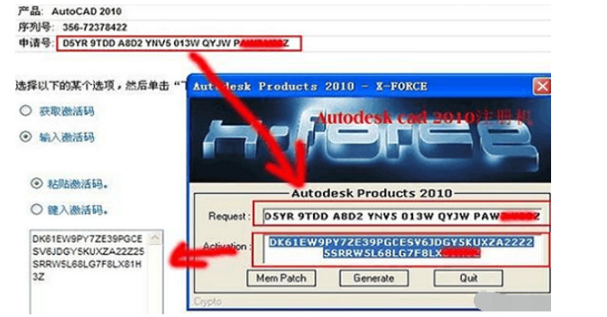 3、然后啟動(dòng)注冊機(jī),在“request”中粘貼剛剛記下的申請碼,首先點(diǎn)擊“patch”,然后再點(diǎn)擊“generate”,此時(shí)會(huì)出現(xiàn)一個(gè)激活碼,我們復(fù)制激活碼然后返回autocad2010;