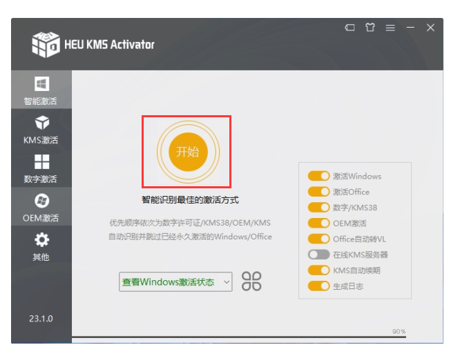 2、直接點擊開始按鈕進行激活,然后等待軟件自動激活的進度為100后,就會提示成功。