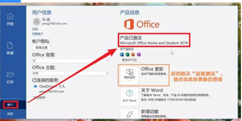 3、上面的操作都完成之后,點擊左下方的“賬戶”查看激活狀態(tài),如果顯示需要激活的話,我們再次點擊“Office更新”即可。