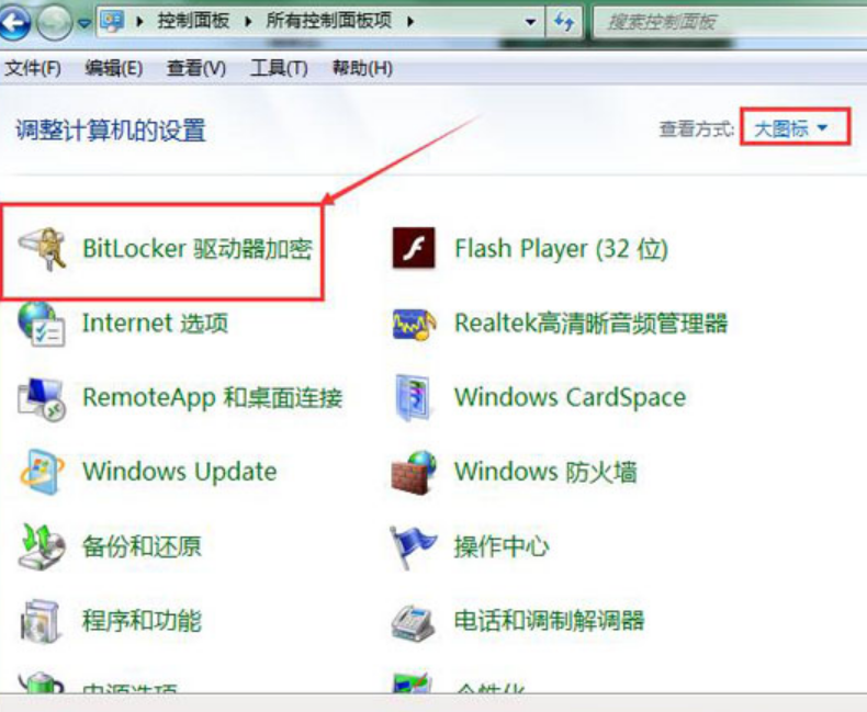 1.點擊電腦開始菜單,打開“控制面板”,接著選擇查看方式為大圖標,找到“bitlocker驅動器加密”選項,點擊打開。