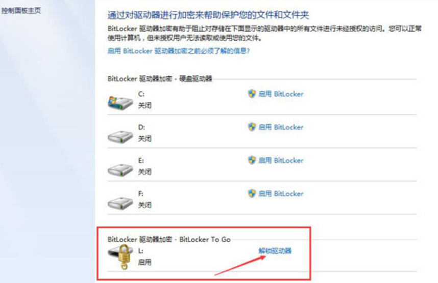 2.在新窗口中點擊底下bitlocker驅動器加密的解鎖驅動器。