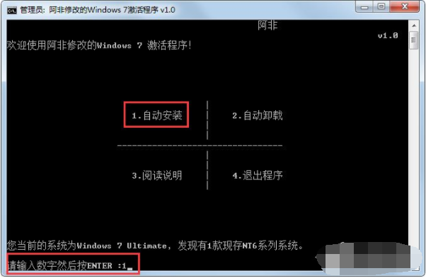 4、進入激活操作頁面,可以看到工具的4大功能,在下面的工具選擇項,輸入數(shù)字“1”,隨后按回車鍵。