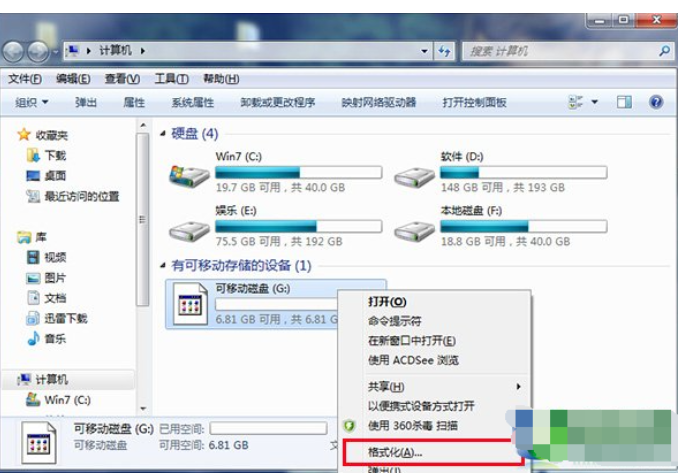 1.插入U盤,打開【我的電腦】,找到可移動磁盤選擇【格式化】。