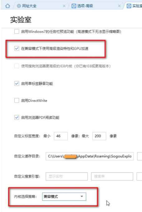 4.勾選“在兼容模式下使用高級(jí)渲染特性和GPU加速”,把內(nèi)核選擇策略更改為“兼容模式”即可成功設(shè)置搜狗瀏覽器兼容模式。