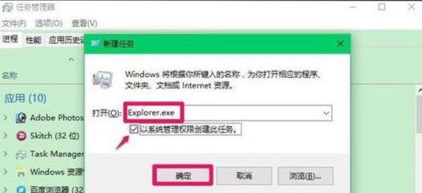 3、打開運(yùn)行窗口中輸入explorer.exe,點(diǎn)擊確定,黑屏問題即可解決。