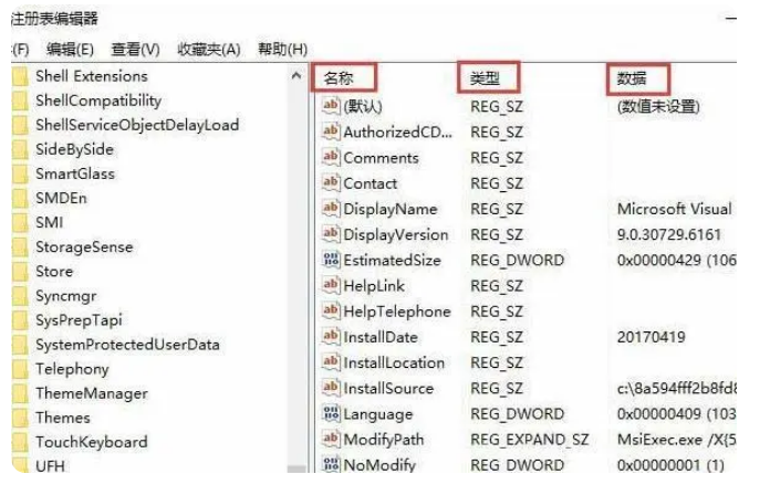3、及菏澤展開Uninstall文件夾,這時我們可以看到名稱、類型、數(shù)據(jù),三項信息。