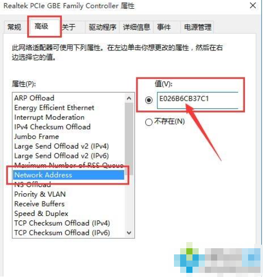 7、在打開的新窗口界面中切換到“高級(jí)”選項(xiàng),在屬性列表界面中找到“Network Address”,點(diǎn)擊“值”,填寫新的mac地址。