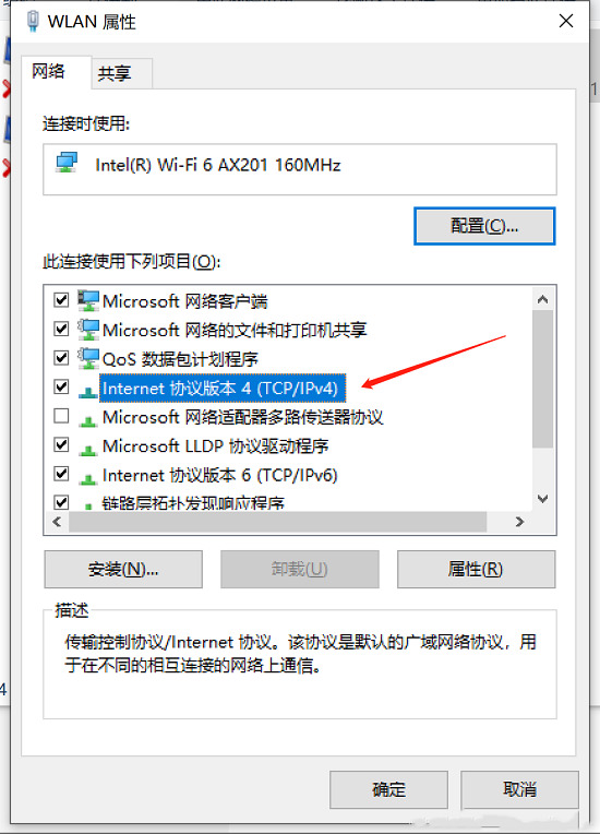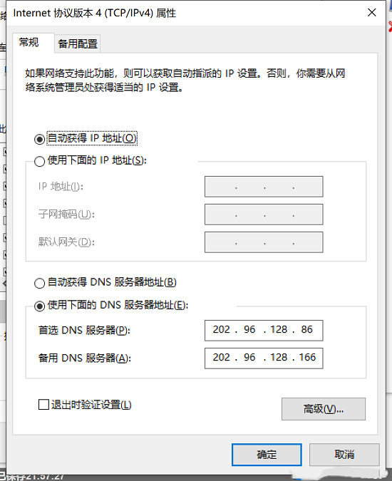 4.點擊版本4,選擇屬性,進行配置; (需要勾選“自動獲取IP地址”,然后在下圖中填寫首選和備用dns服務器)。