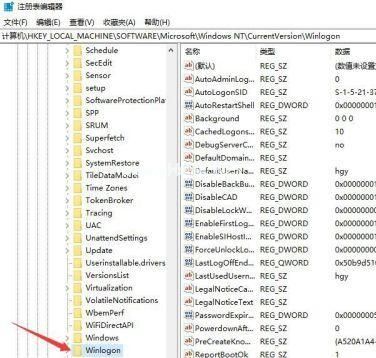 5、我們在注冊表編輯器窗口界面中找到計算機->HKEY_LOCAL_MACHINE->SOFTWARE->Microsoft->Windows NT->CurrentVersion->Winlogon。