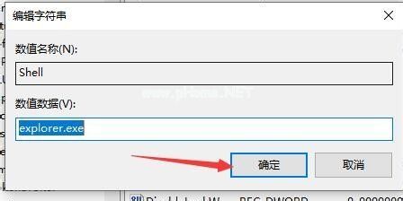 7、鼠標雙擊它,在彈出的窗口界面把數(shù)據(jù)修改為explorer.exe,點擊【確定】重啟電腦即可解決win10開機黑屏只有鼠標的問題