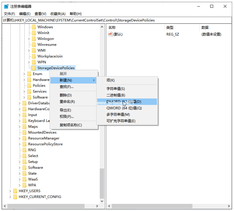 3、接著將項(xiàng)命名為StorageDevicePolicies,在右邊空白處,鼠標(biāo)右鍵點(diǎn)擊新建【DWORD(32位)值】,將其命名為WriteProtect,鼠標(biāo)雙擊打開。