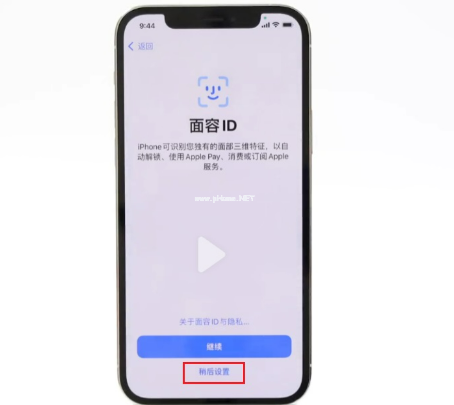 5、連接上網(wǎng)絡(luò)之后,iPhone 手機(jī)就會(huì)與蘋果官方服務(wù)器進(jìn)行連接,表示已完成新 iPhone 14 驗(yàn)證與激活。再根據(jù)提示點(diǎn)「繼續(xù)」,會(huì)提示需要設(shè)置面容ID,就是人臉識(shí)別。由于人臉識(shí)別今后隨時(shí)可以在 iPhone 設(shè)置中進(jìn)行操作,這里可以點(diǎn)「稍后設(shè)置」直接跳過。
