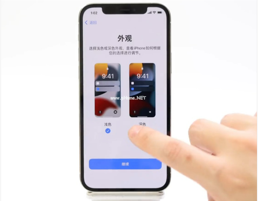 12、這里 iPhone 14激活就快完成了,下面就是系統(tǒng)外觀設(shè)置選擇啟用淺色模式還是深色模式,之后點(diǎn)擊「繼續(xù)」,再設(shè)置一下放大顯示,就可以進(jìn)入手機(jī)桌面了,蘋果14系列手機(jī)激活就完成了。