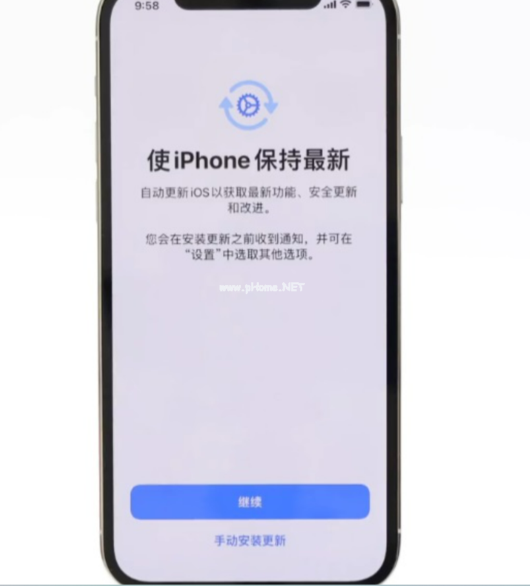 10、Apple ID賬號(hào)登陸好了之后,接下來的「使iPhone保持最新」操作界面,點(diǎn)繼續(xù)或手動(dòng)安裝更新都行,如果選擇前者,今后iPhone會(huì)自動(dòng)更新iOS系統(tǒng),如果是后者,則需手動(dòng)升級(jí)系統(tǒng)。