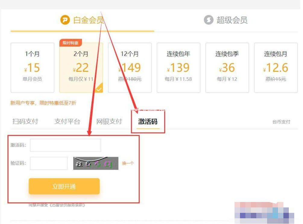 4、選擇進入完成之后,就能夠在下面的支付選擇中選擇【激活碼】。再輸入你的激活碼充值即可。