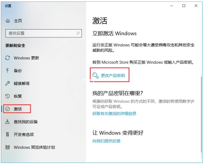 3、點擊左邊的激活,找到“更改產(chǎn)品密鑰”并點擊打開。