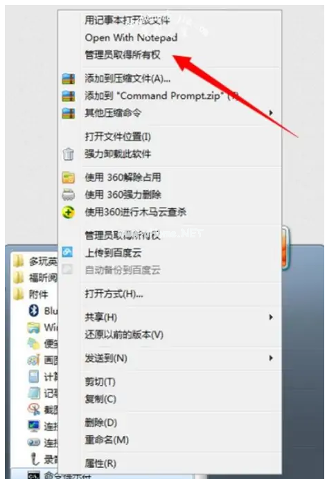 2、打開所有程序里的附件,鼠標(biāo)右鍵命令提示符,選擇管理員取得所有權(quán)。