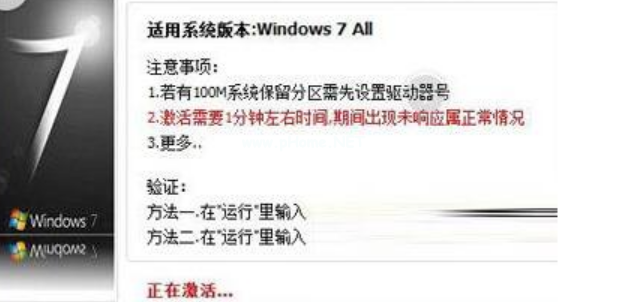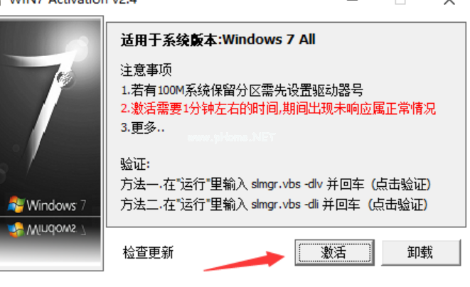 2、進入到win7激活工具軟件主界面,在界面中有注意事項和驗證等信息,直接點擊激活選項,開始激活電腦。