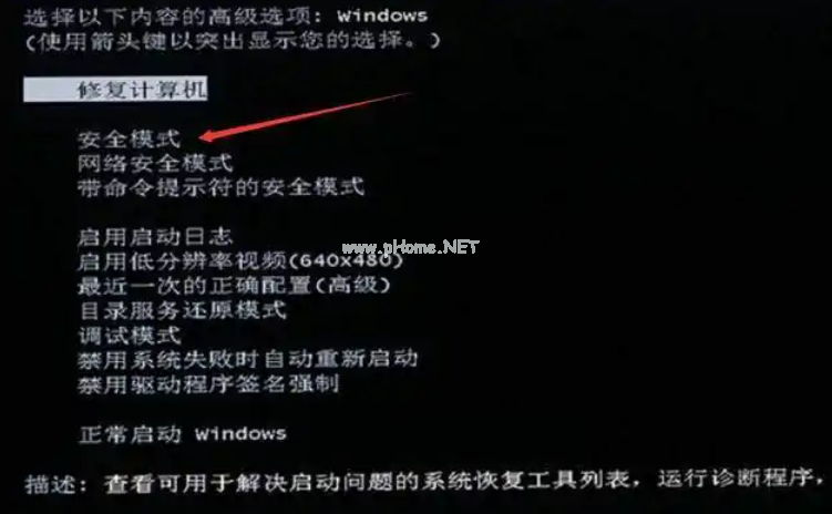 進入高級啟動選項后,按住鍵盤上的↑↓鍵,選擇“安全模式”回車即可進入安全模式。