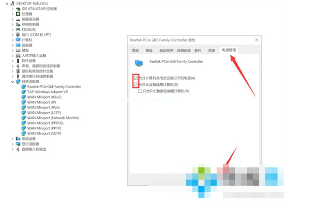 3、點(diǎn)擊電源管理,接著勾選允許計(jì)算機(jī)關(guān)閉此設(shè)備以節(jié)約電源,勾選允許此設(shè)備喚醒計(jì)算機(jī),點(diǎn)擊確定即可修復(fù)解決。