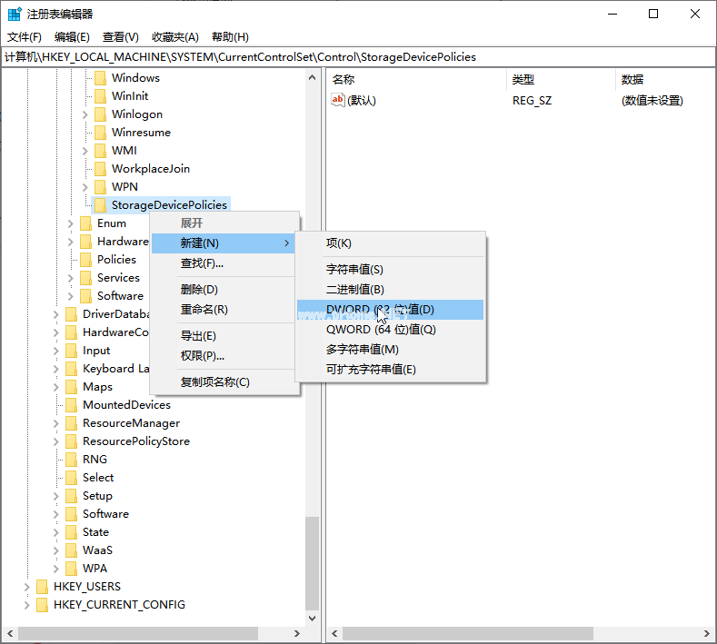 3、接著將項(xiàng)命名為StorageDevicePolicies,接著在右側(cè)空白處,鼠標(biāo)右鍵點(diǎn)擊新建【DWORD(32位)值】,將其命名為WriteProtect,雙擊打開。