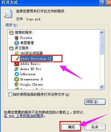 3、在如以下界面選擇Photoshop程序,點(diǎn)擊確定即可。