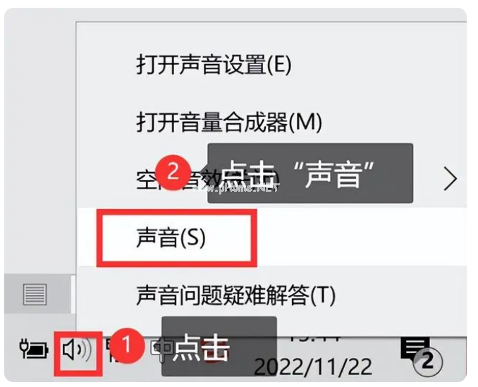 1、筆記本麥克風(fēng)沒聲音怎么辦呢?在右鍵點(diǎn)擊右下角的聲音圖標(biāo),我們選擇“聲音”選項。