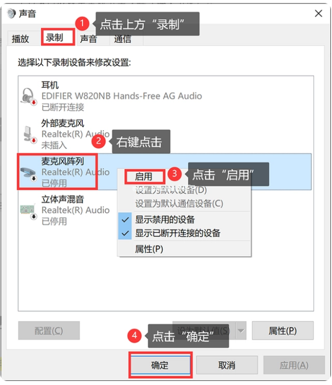2、在上方可以找到“錄制”選項,右鍵點(diǎn)擊“麥克風(fēng)”,然后選擇“啟用”,點(diǎn)擊“確定”即可。