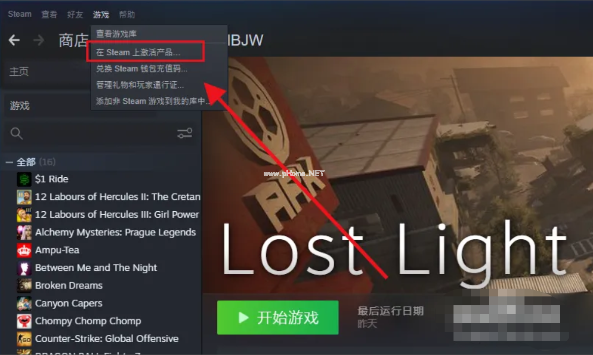 6、安裝好Steam客戶端后,請購買我們的激活碼,收到激活碼后,請登錄您的Steam客戶端,并點擊游戲,在彈出的選項中選擇在Steam上激活產(chǎn)品。