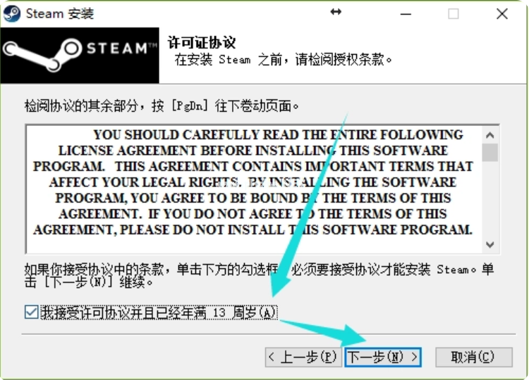 ②勾選“我接受許可協(xié)議并且已經(jīng)年滿13周歲”,在此點擊“下一步”