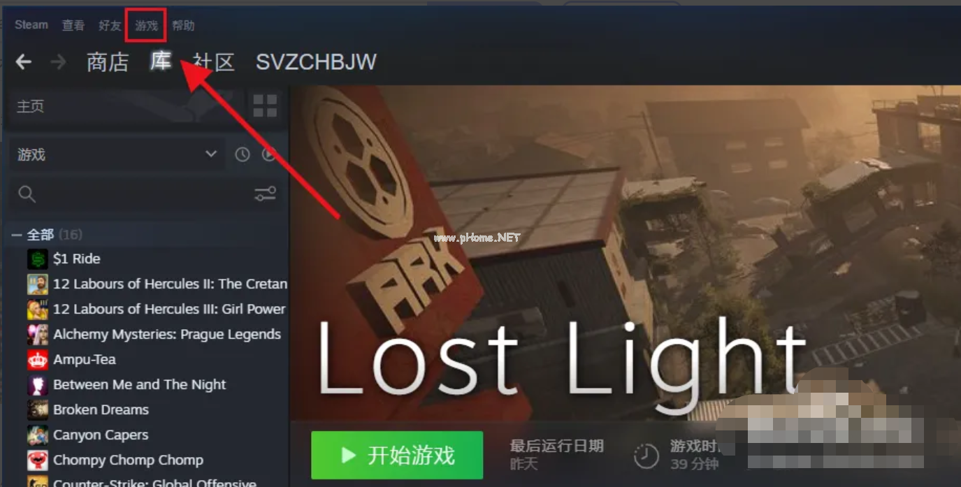 1、首先,進(jìn)入steam以后,點擊主頁面左上方的游戲。
