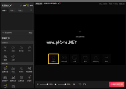 2、進(jìn)入直播伴侶操作界面后,點擊界面的【攝像頭】。