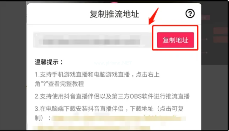 5、復(fù)制彈出的推流地址,然后在電腦上安裝“抖音直播伴侶”。