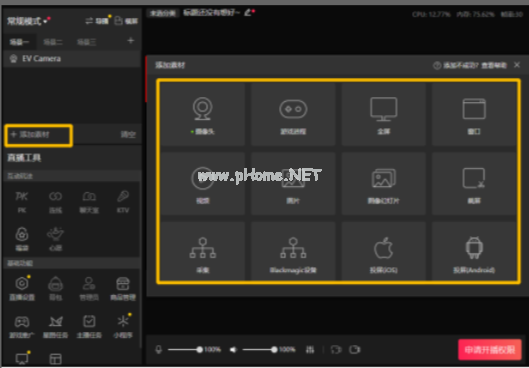 5、點擊【添加素材】,可以選擇直播疊加場景。