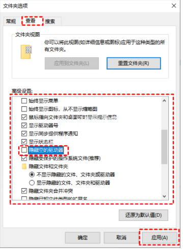 3. 在文件夾選項(xiàng)窗口界面中,切換到查看選項(xiàng)卡,在高級(jí)設(shè)置框中,找到并取消勾選隱藏空的驅(qū)動(dòng)器,點(diǎn)擊應(yīng)用。