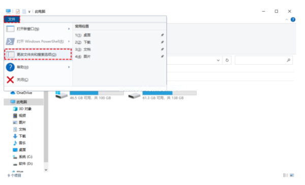 2. 點(diǎn)擊左上方的文件,在打開(kāi)的下拉項(xiàng)中,選擇更改文件夾和搜索選項(xiàng)。