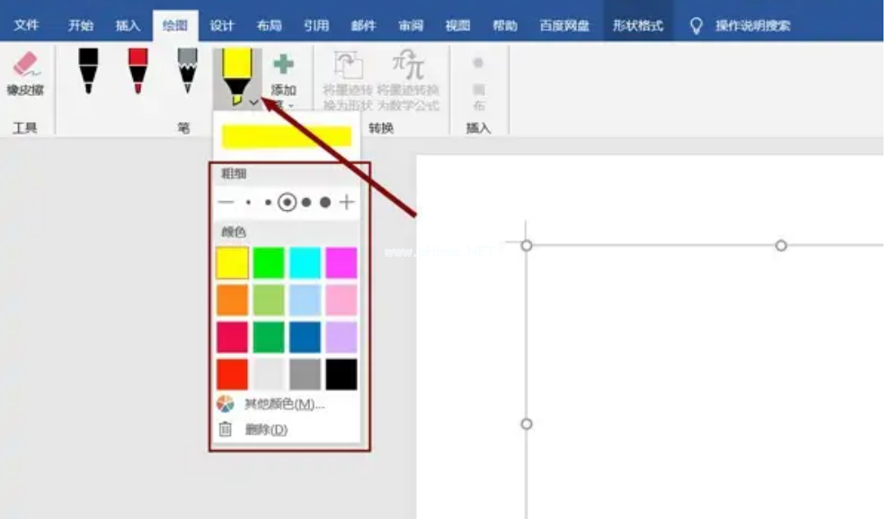 3、點(diǎn)擊需要筆的右下角的倒三角圖標(biāo),選擇畫筆顏和粗細(xì)。