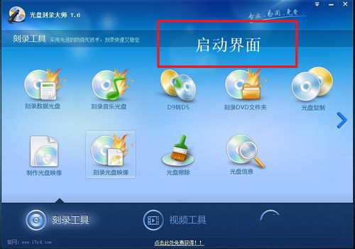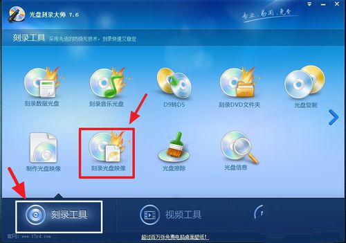 在刻錄大師的界面中,下方有三個功能選項“刻錄工具”、“視頻工具”、“音頻工具”。在這次分享中需要用到的是“刻錄工具”-〉“刻錄光盤映像”