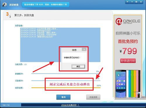 在這一步,即“第二步:選擇刻錄設備并設置刻錄參數(shù)”,也就是刻錄的選擇,及檢查光盤是否可刻錄等,會自動檢測。一切就緒后,程序會提示“就緒”,而且“開始刻錄”的按鈕也會變成可操作。單擊“開始刻錄”。