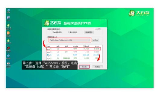 第五步:選擇“Windows 7 系統(tǒng),點(diǎn)擊“系統(tǒng)盤(c盤)”再點(diǎn)擊“執(zhí)行”。