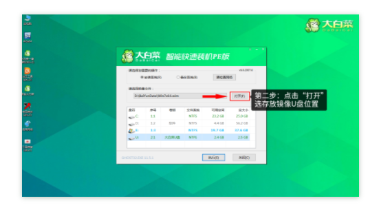 第二步:點(diǎn)擊“打開”選存放鏡像U盤位置。(每個(gè)人存放不一樣,能查詢鏡像的位置就行)
